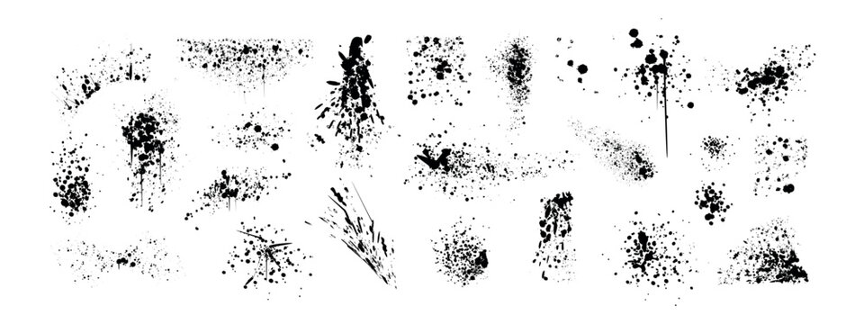Spray paint drips, ink blots or splatters set. Black splashes, graffiti speckles and inkblot spots with dust effect. Paintbrush splotch, inky drops or liquid blobs. Abstract dirty grunge splash stains