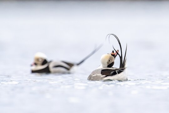 Long-tailed duck (Clangula hyemalis), male in splendour plumage during plumage care, Batsfjord, Båtsfjord, Varanger Peninsula, Finnmark, Northern Norway, Norway