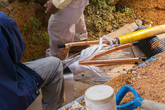 template Technician Fiberoptic Fusion Splicing. Worker connecting for Cable Internet signal and Wire connection with Fiber Optic Fusion Splicing machine,fiber optic cable splice machine in work