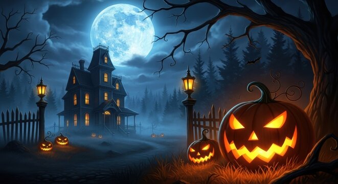 Spooky Halloween Night with Haunted House and Glowing Pumpkins Under Full Moon
