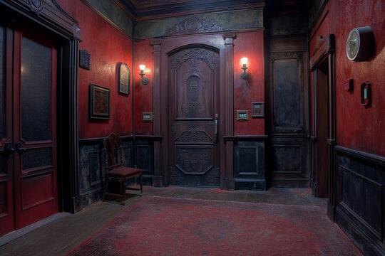 Exploring the atmospheric and mysterious vintage mansion hallway with ornate antique interior and dimly lit classic design, featuring dark woodwork, elegant decor, red walls, and spooky ambiance