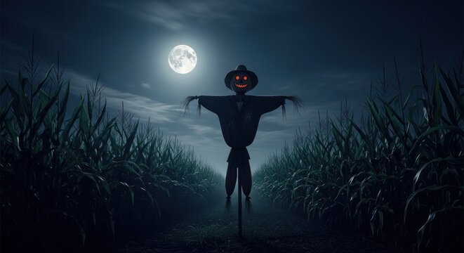 A menacing scarecrow with glowing red eyes stands in a cornfield under a full moon at night, creating a spooky Halloween-like atmosphere