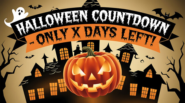 A glowing orange pumpkin with a spooky grin in front of a dark silhouette of a haunted house evokes excitement and anticipation for Halloween