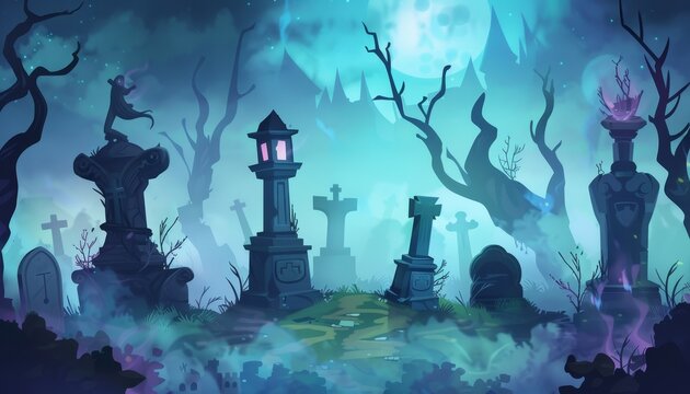 Eerie halloween night with spooky cemetery scene