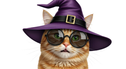 A ginger cat, wearing round sunglasses and a purple witch's hat, stares inquisitively.