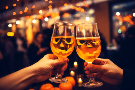 Two glasses toasting with Halloween pumpkin face, party in a bar, alcohol, drink