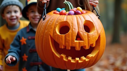 A captivating hyper realistic photograph captures joyful children in Halloween costumes, carrying a meticulously carved pumpkin bucket overflowing with an assortment of vibrant candies, highlighting t