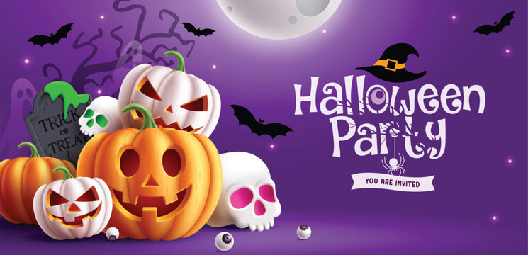 Halloween party text vector design. Halloween party invitation card with pumpkin squash lantern and moon elements in night background. Vector illustration kids horror party invitation.