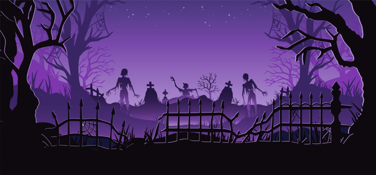Halloween background with zombie and walking dead, cemetery fence for holiday poster. Creepy and mystical background with cross, grave, tombstone and dead man for dark fear october design