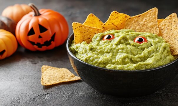 Green guacamole styled with tortilla chips shaped like monster with Halloween decorations