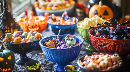 A variety of Halloween treats displayed in colorful bowls with spooky decorations enhancing the festive atmosphere