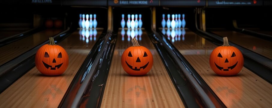 Haunted bowling with pumpkins as bowling balls and ghosts as pins, set in a spooky alley, Halloween sport, haunted bowling