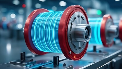 Futuristic fiber optic cable winding on a spool in a factory setting