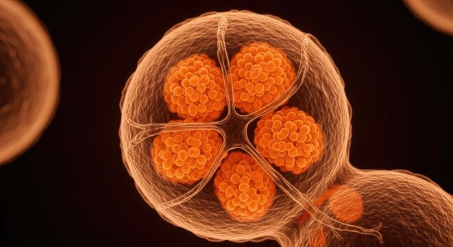 High magnification view of anthrax bacillus with glowing spore cells under microscope in abstract petri dish, microbiology, infectious disease, bioterrorism, science, danger, bacterial structure.