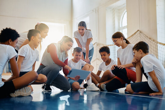 Young sports teacher and her students going through exercise plan on physical education class at school.