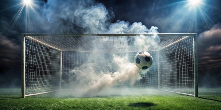Dramatic Soccer Goal Ball Entering Net Amidst Smoky Atmosphere Under Bright Stadium Lights