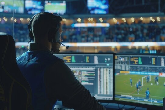high-tech sports analytics center where coaches and players review performance data on large interactive screens, optimizing strategies in real-time