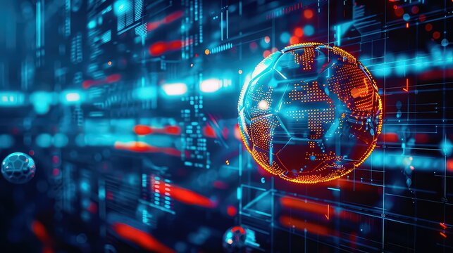 Soccer ball on the field with digital graphs showing sports analytics and online soccer betting