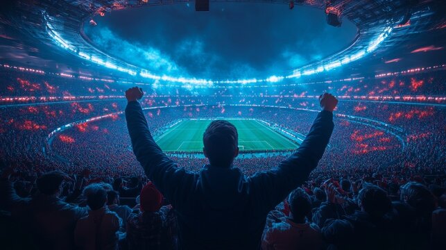 Excited fans celebrate passionately during a match at a vibrant sports stadium at night