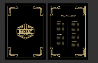 Luxury vintage bakery shop food menu card template ornamental black and golden with emblem logo for hotel cafe bar coffee shop vector print ready