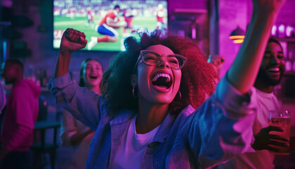 Friends Cheering for Their Soccer Team, Playing in an International Cup Final. Supportive Fans Standing in a Bar, Cheering, Raising Hands and Shouting. People Celebrate When Team Scores a Goal.