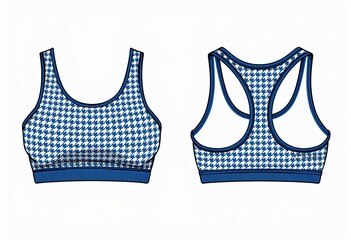 Trendy women’s flared pants, quilted bell bottom trousers, stylish sports bra top set, cad drawing, flat vector fashion illustration