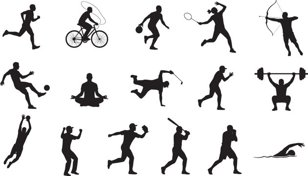Vector illustration set of black silhouettes featuring men and women athletes in motion including people running and players for soccer, basketball, and tennis in various sports competition poses