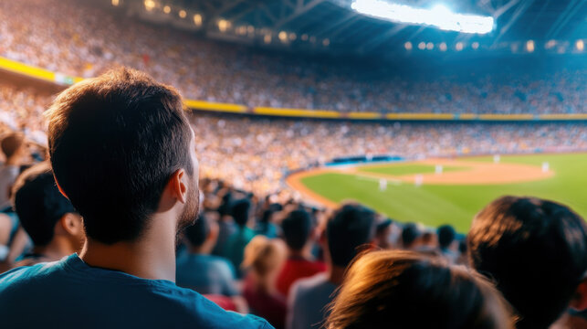 person watching baseball game in crowded stadium, filled with excitement and anticipation. atmosphere is vibrant and energetic, capturing essence of live sports event