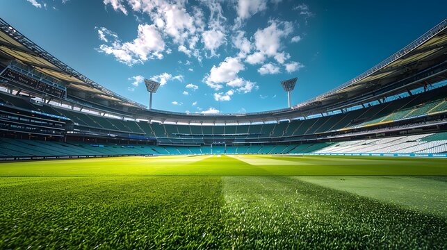 The interior view of an empty cricket stadium, with green grass and blue sky