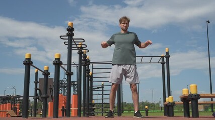 Side motion of young sexy female bodybuilder posing near bars at sports ground in summer sunny day. Sportswoman with perfect muscular body wearing fashionable outfit, relaxing after training outdoors.