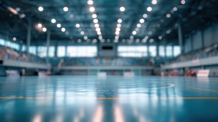 Eye-catching photo of blurred background of a futsal arena with an empty court and seating area. The image captures the indoor sports facility, highlighting the court markings.