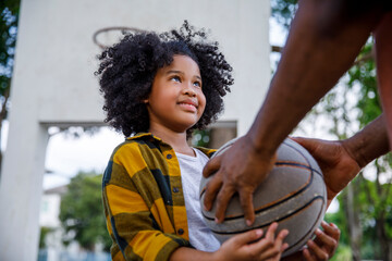 Family basketball, sports father and child, support while training kid in on court in summer, help learning sport game and teaching young athlete. Motivation dad helping African sports person