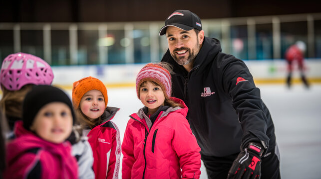 female coach holding a clipboard is standing in a gymnasium with a group of students seated on the floor in the background