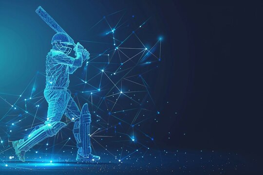 digital blue low poly cricket player with glowing data streams ai in sports analytics, player performance tracking systems, match prediction algorithms, training programs. wireframe player.