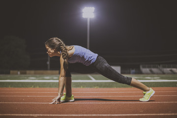 Flash-lit angular sports photograph of a trail runner doing warming-up