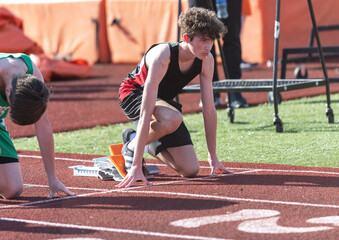 Male athlete runner sprinter young man running, workout goal and exercise for wellness, sport and training. Cardio on the track at the stadium. Muscular, sportive guy. Healthy lifestyle. Speed