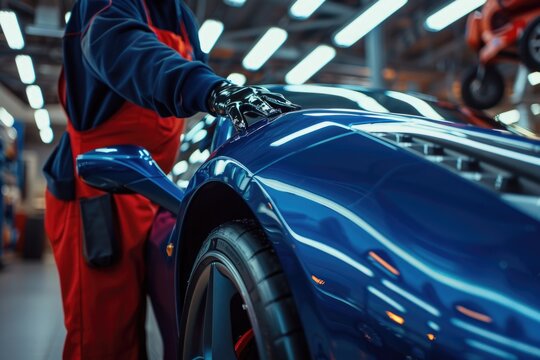 Detailing a Red Sports Car Headlight with Professional Equipment in a Garage Setting, Generative AI