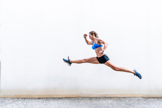 Strong sportswoman leaping against wall