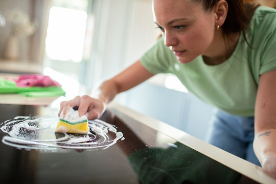 Young adult woman scrubbing kitchen stovetop, focused at home