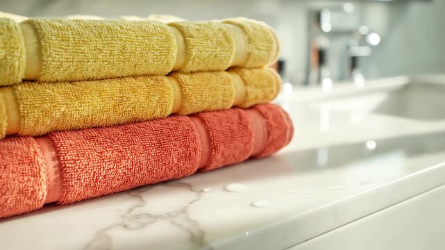 High angle architectural view of a pristine minimalist bathroom counter stacked with folded lemon yellow and coral towels contrasting against white marble spa, bathroom, coral