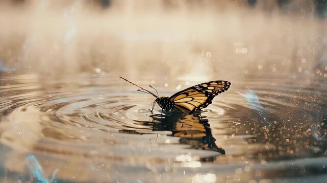 Butterfly delicately resting on a water surface with sun reflection, serene aquatic moment