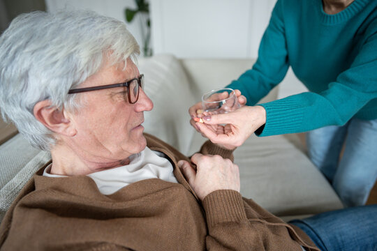 Struggling sad pensioner taking pills from wife hand before fall. Chest gripping, urgent medical need, aging failure issues, spousal support, drug prescription, cardiac collapse, high pressure