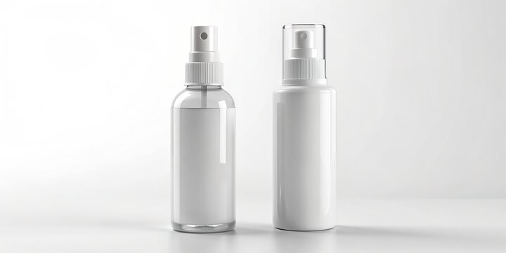 Isolated white plastic spray bottle mockup with small liquid container and atomizer pump, empty label space, on a clean white background, 3D rendered image.