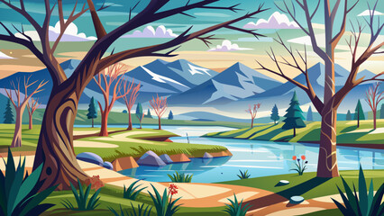 Very beautiful view of bare trees reflected in calm waters of Spring Lake, symbolizing quiet renewal and the tender arrival of early spring in nature’s cycle.