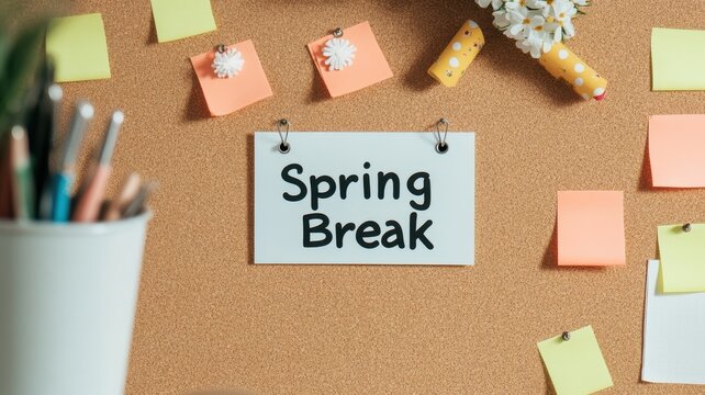 Spring Break concept. Spring Break notice pinned on a corkboard with colorful sticky notes and pens nearby.
