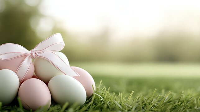 Colorful Easter eggs arranged neatly on green grass with a soft focus background capturing the essence of spring celebrations