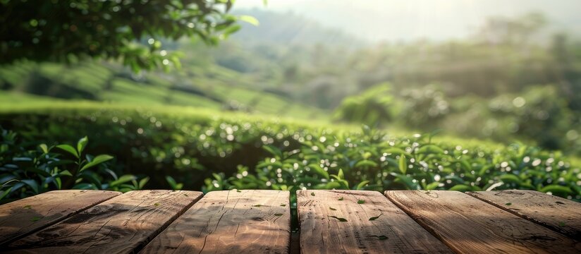 Wooden table with a blurred tea plantation backdrop providing ample copy space for showcasing tea related products along with the scenic tea farm view