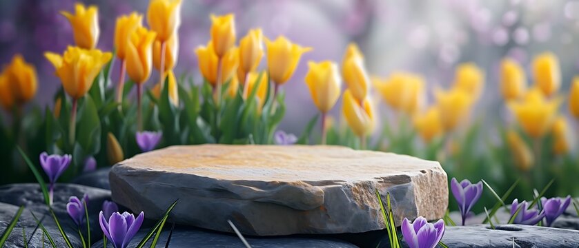 natural stone pedestal in the garden for product presentation with yellow tulips, showcase for easter, spring, cosmetic, healthy products. Template, layout for product advertising, marketing, sales.