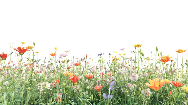 A vibrant and lively garden illustration featuring a diverse collection of blooming flowers and lush green grass, perfect for spring and summer themes