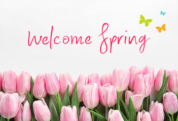 Welcome spring day. Flower tree for Happy holidays greeting card. Typography for spring holidays.